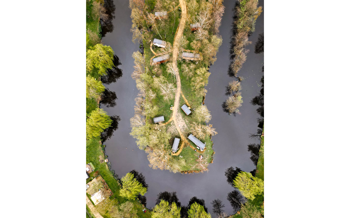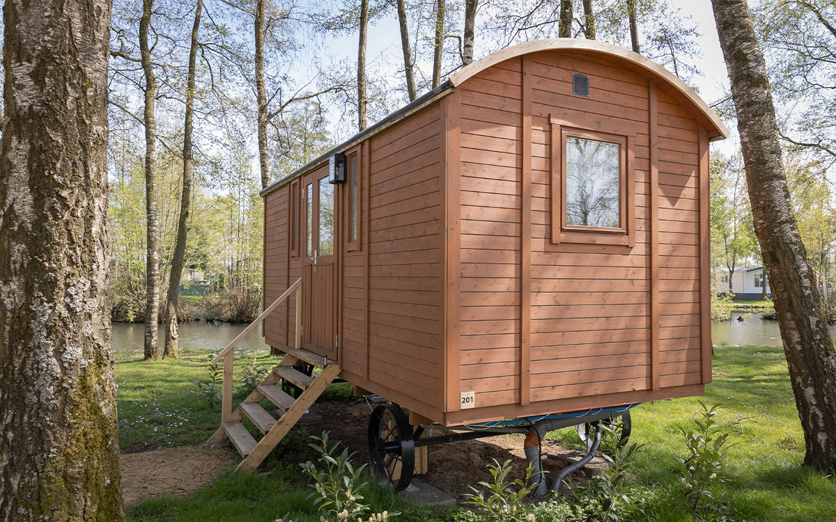 De Pipowagens liggen op een idyllisch eilandje binnen het park, omringd door groen en water, wat zorgt voor een rustgevende en unieke ervaring.